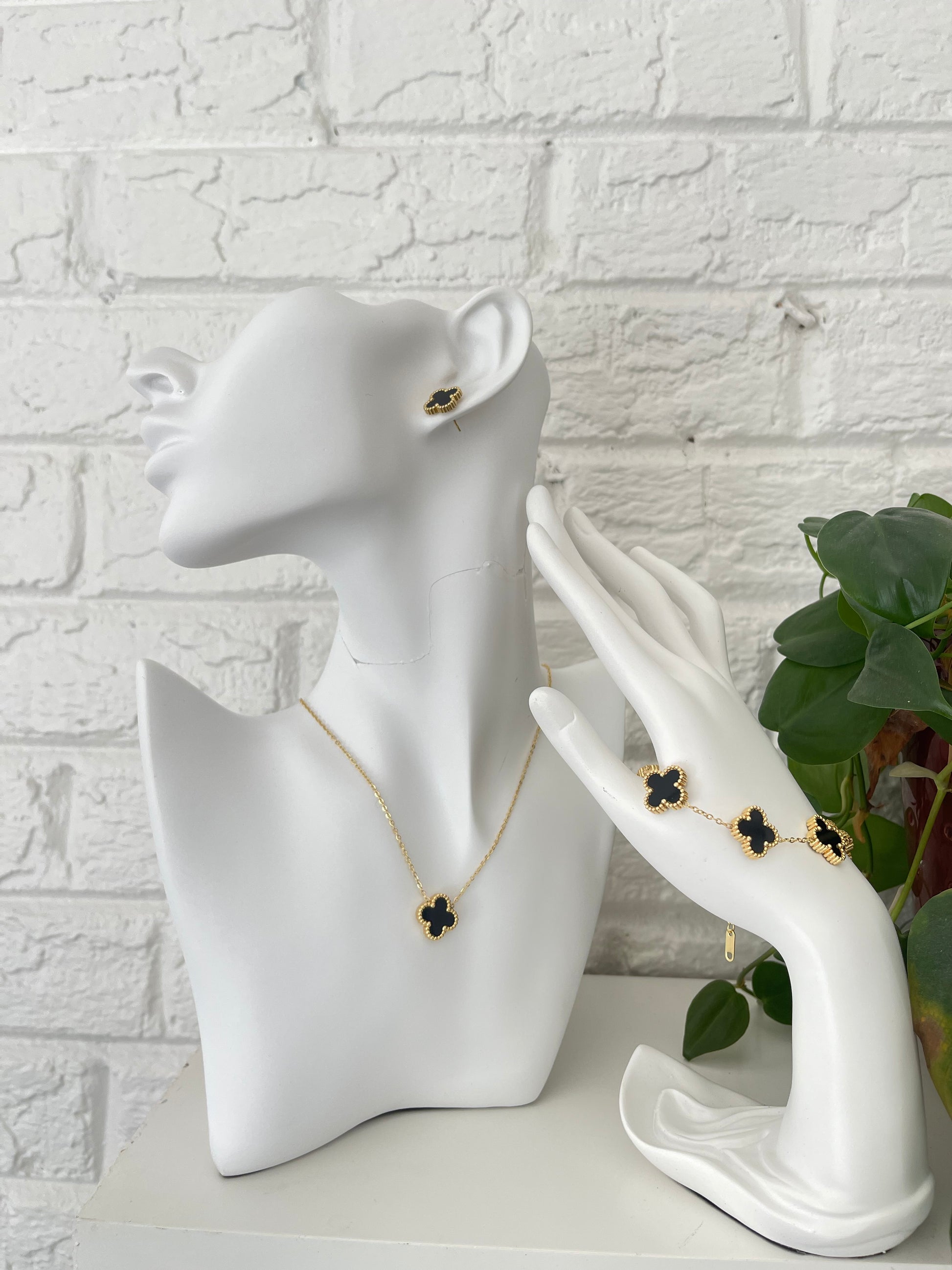Introducing our Clover Set; a beautiful trio of necklace, bracelet, and earrings adorned with stunning black gemstones. Crafted with hypoallergenic materials. Say goodbye to tarnishing and hello to timeless elegance.